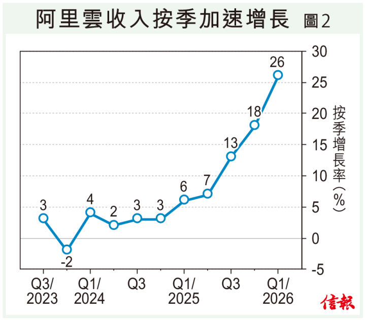 不过,阿里的云计算增长仍是惊人的,最新季度增速达26%。按照摩根士丹利日前最新预测,阿里云计算未来3年收入将会翻倍,2026年收入增速由30%上调至32%,2027年从30%升至40%,触发该行把阿里ADR目标价由165美元升至200美元,以阿里1股ADR等于8股港股计,目标价195元。